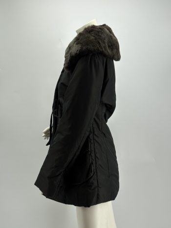 Elegante giacca da donna Maska, realizzata in Italia, con collo in pelliccia sintetica morbidissima e dettagli in pelle marrone con fibbie decorative.
