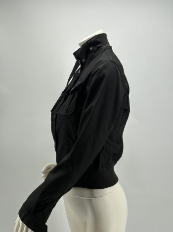 Modello corto con chiusura frontale a bottoni automatici, colletto alto con linguetta regolabile, due tasche frontali con patta e due tasche laterali inclinate.