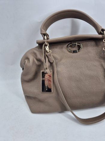 Manici in pelle chiara con dettagli in metallo lucido, interno spazioso e foderato, ideale per l’uso quotidiano o come borsa da lavoro.