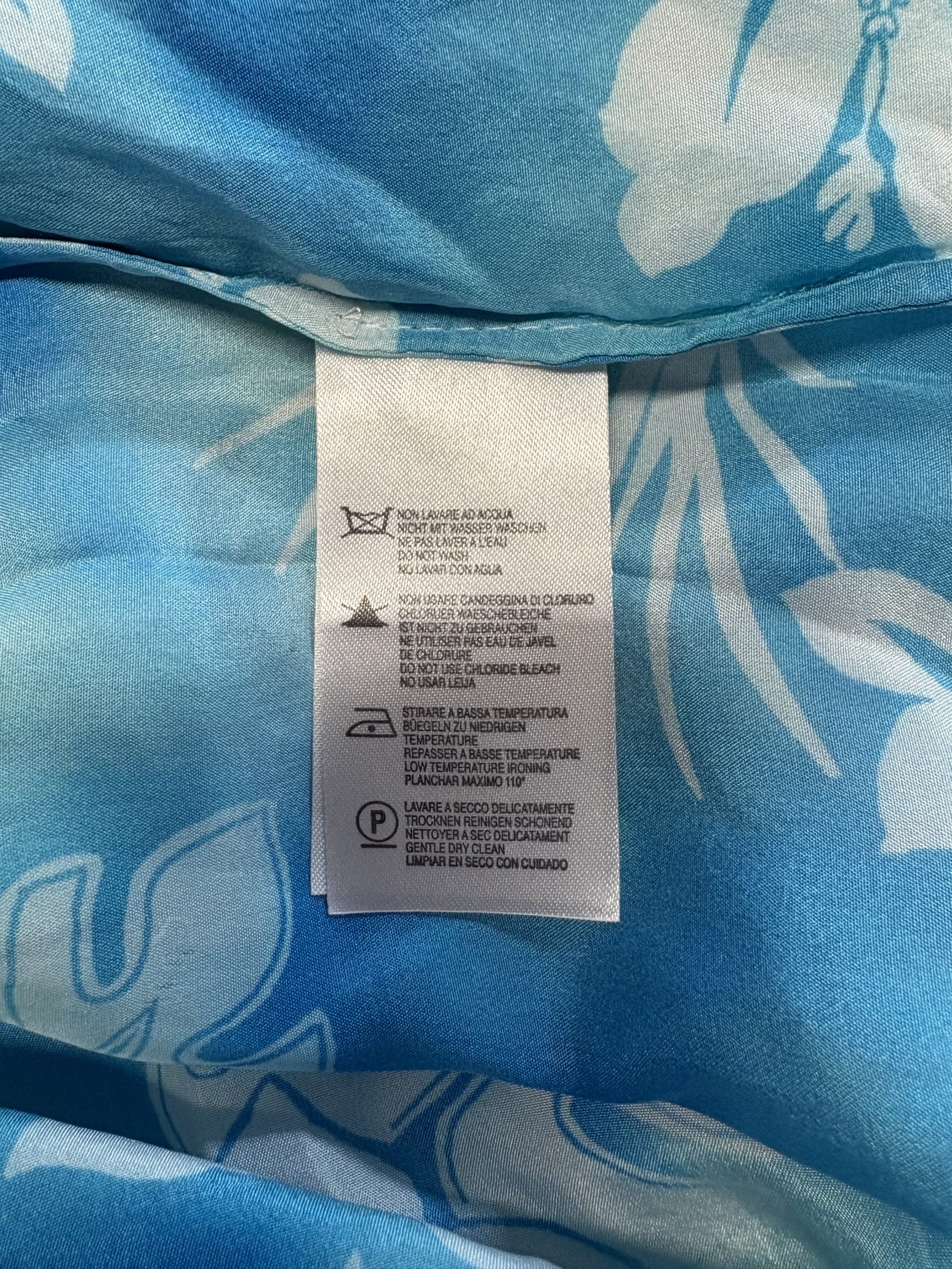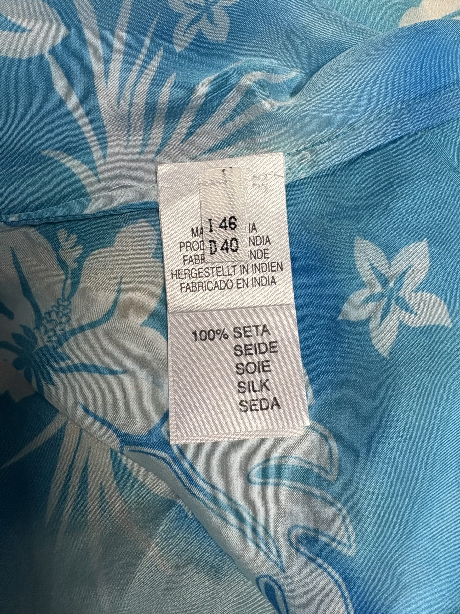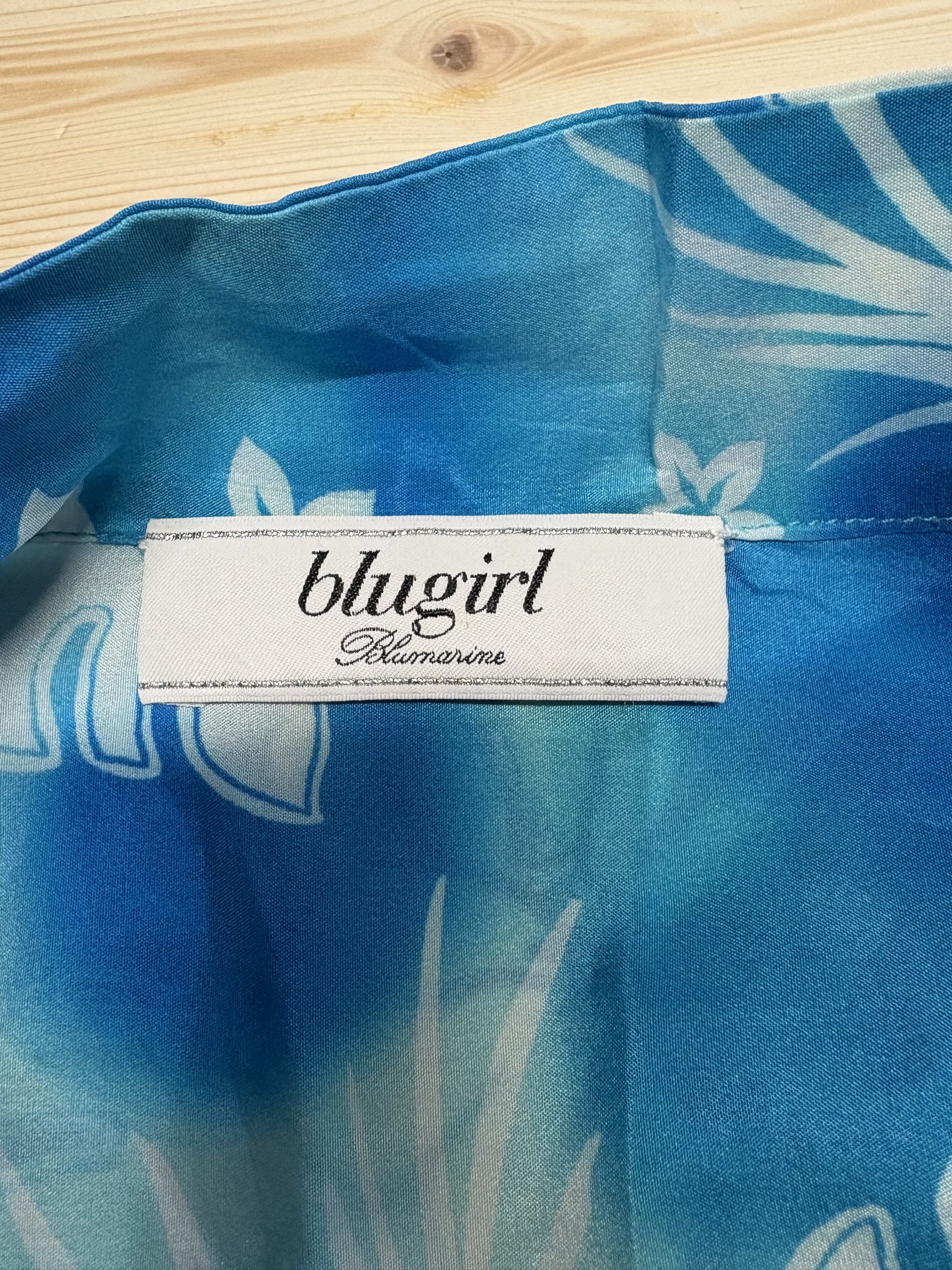 Elegante e raffinato abito chemisier Blugirl Blumarine, realizzato in 100% seta pura, con stampa floreale tropicale nei toni dell’azzurro e del bianco.