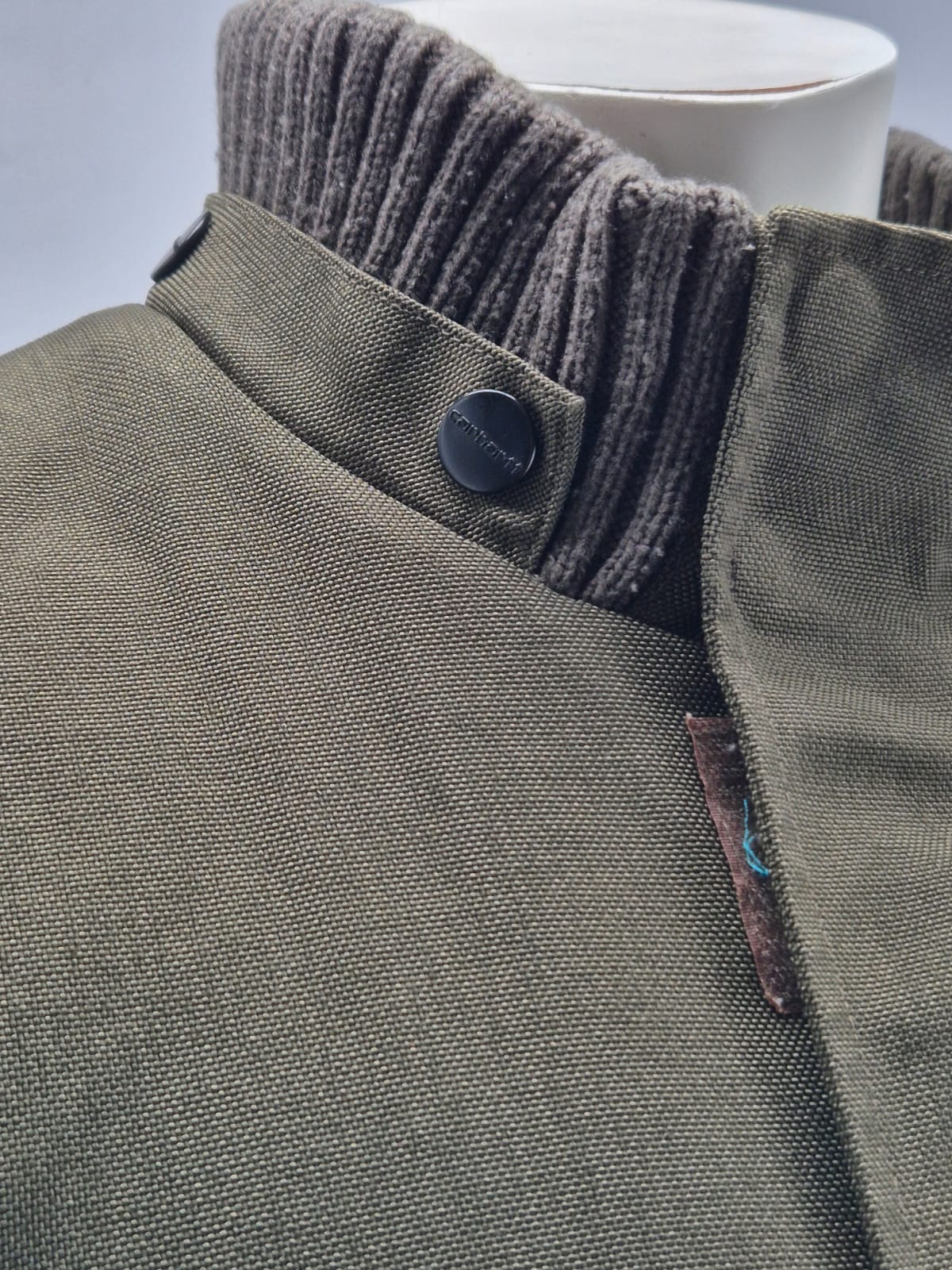 Giacca originale Carhartt, taglia M, colore verde oliva, realizzata in nylon resistente e impermeabile, con imbottitura interna calda in poliestere.