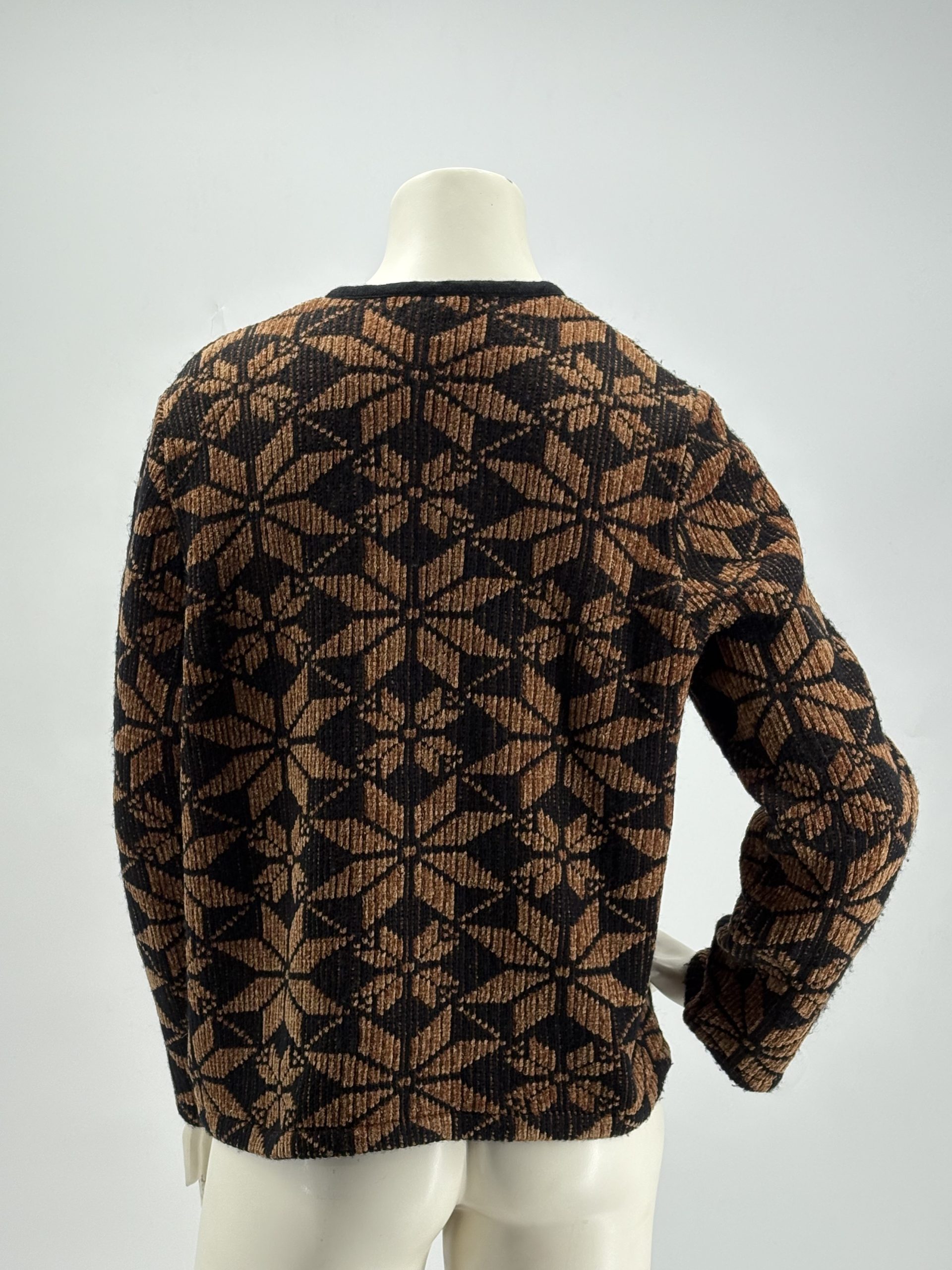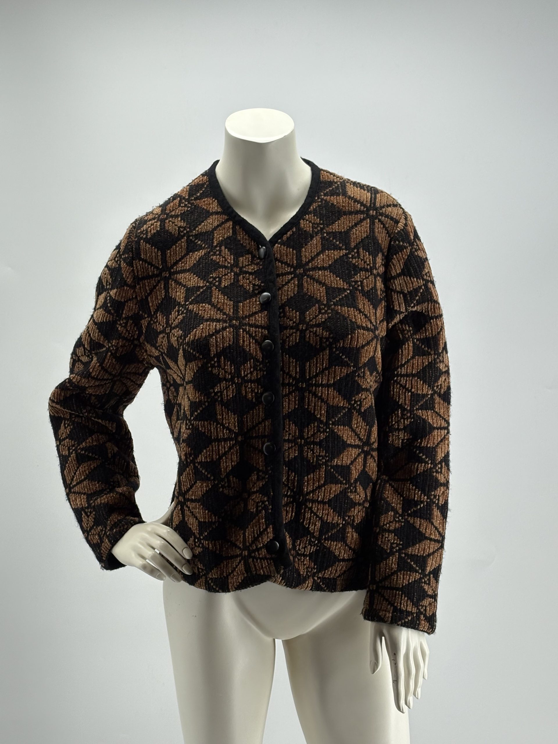 Design elegante con fantasia geometrica nei toni nero e marrone, chiusura frontale con bottoni rivestiti.