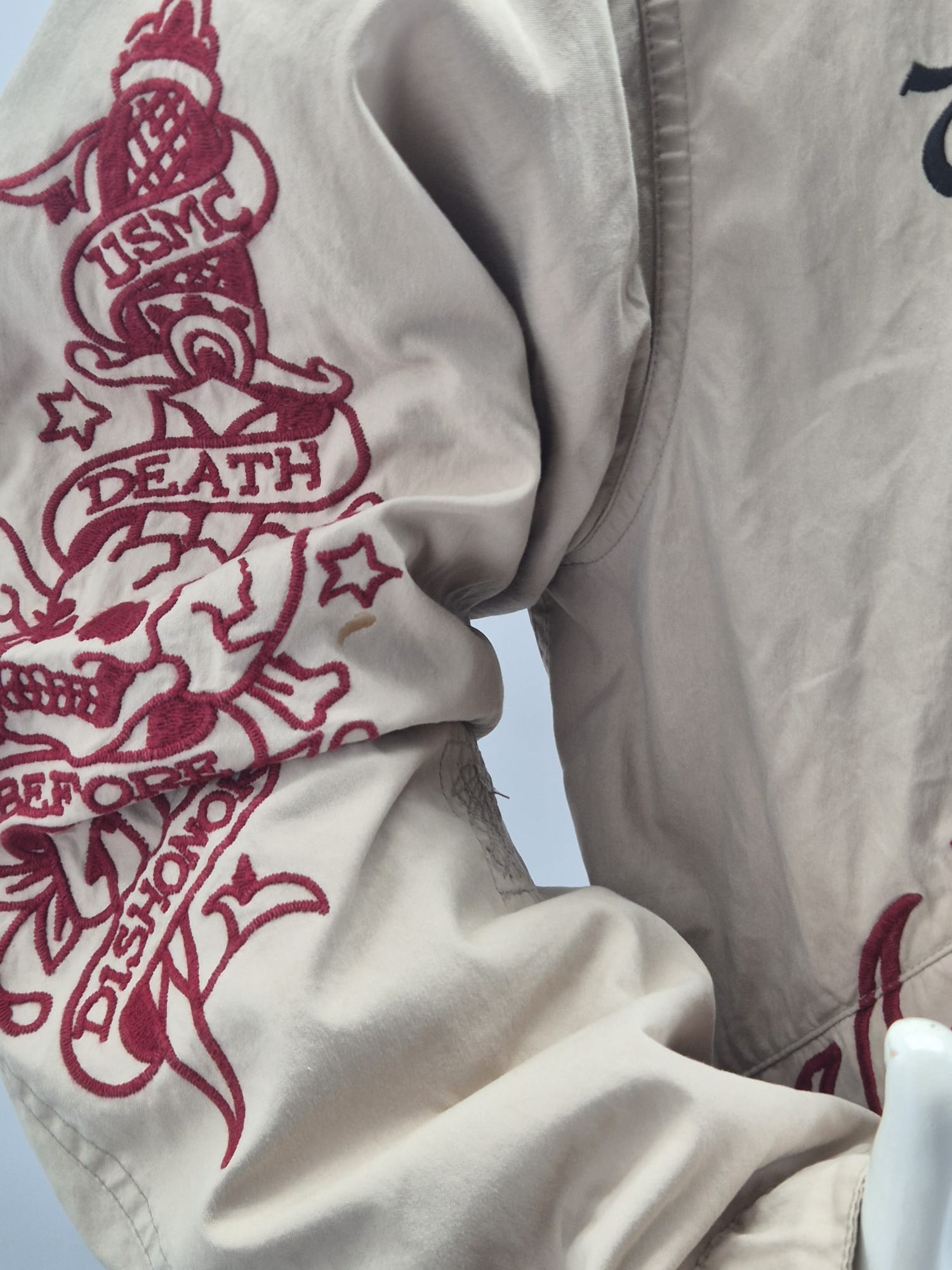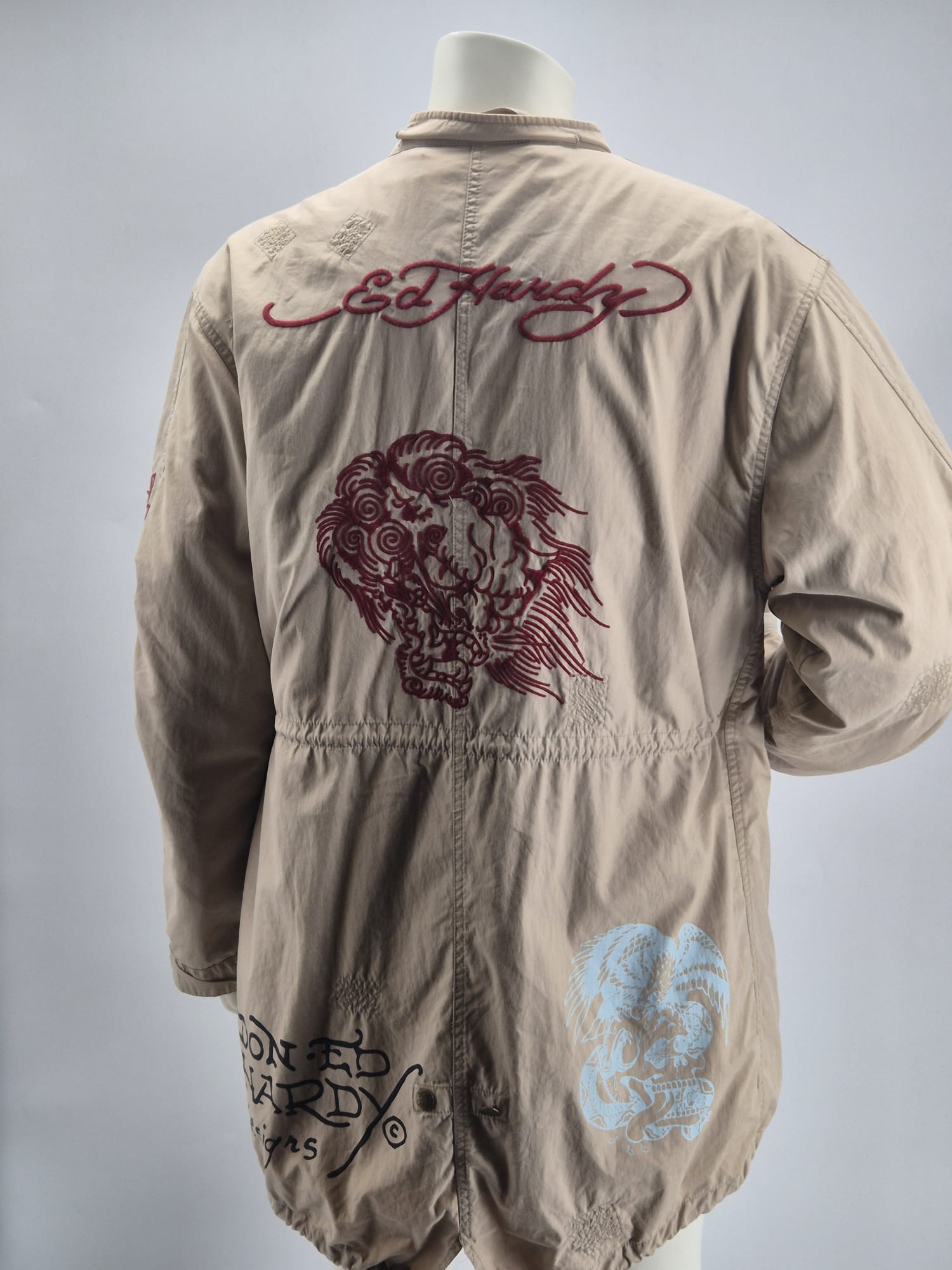 Modello parka / field jacket in color beige, con iconiche grafiche e ricami tattoo sul fronte, maniche e schiena.