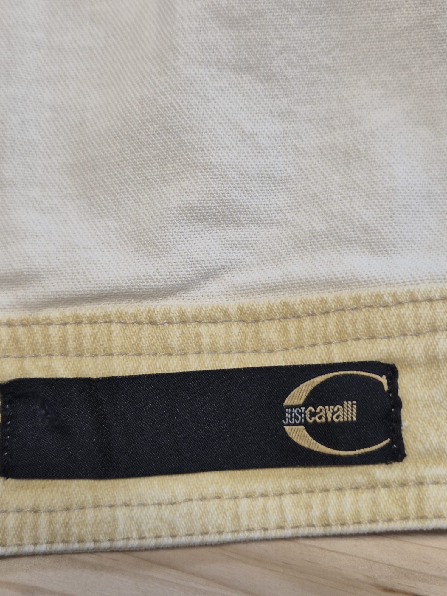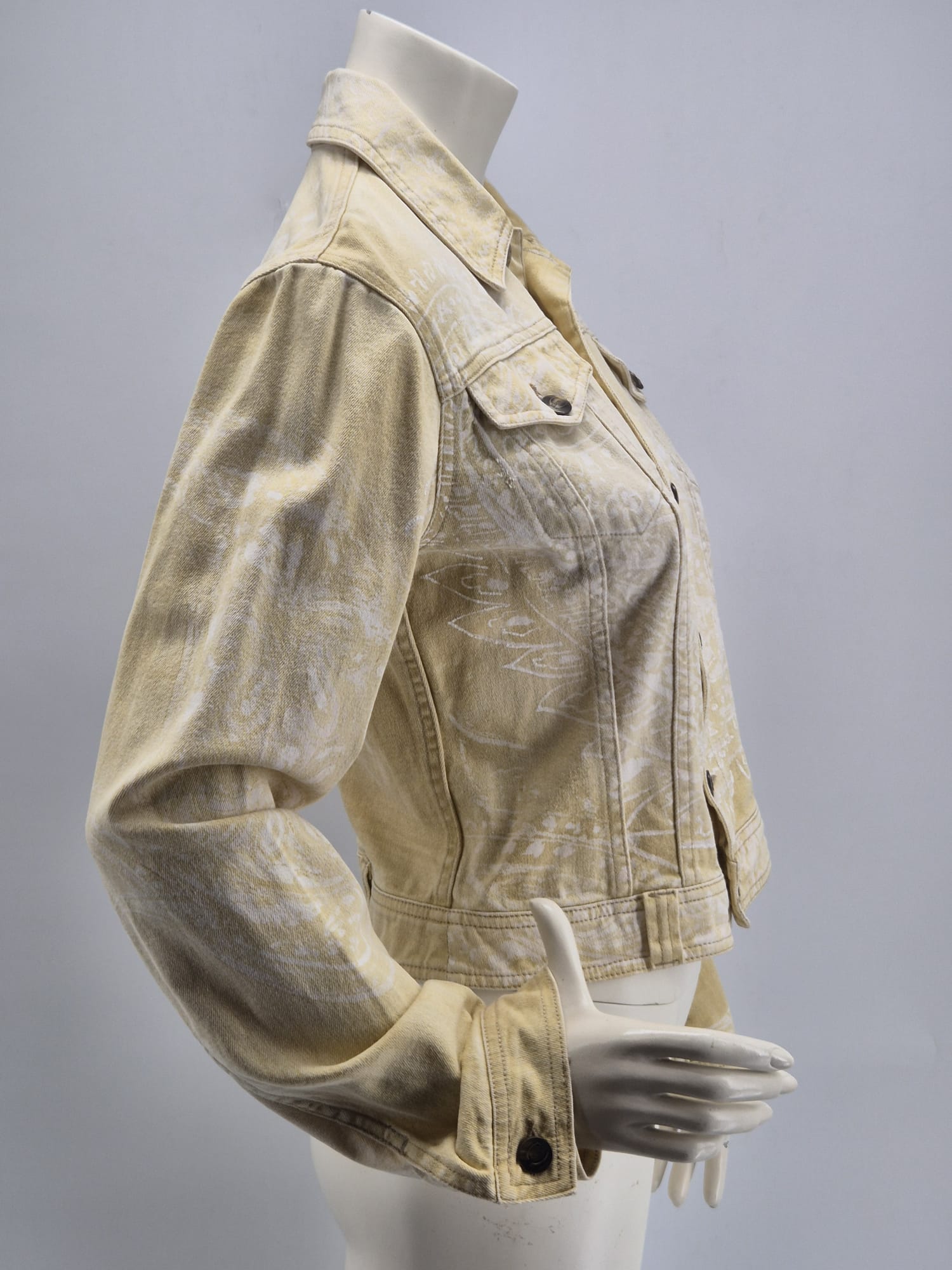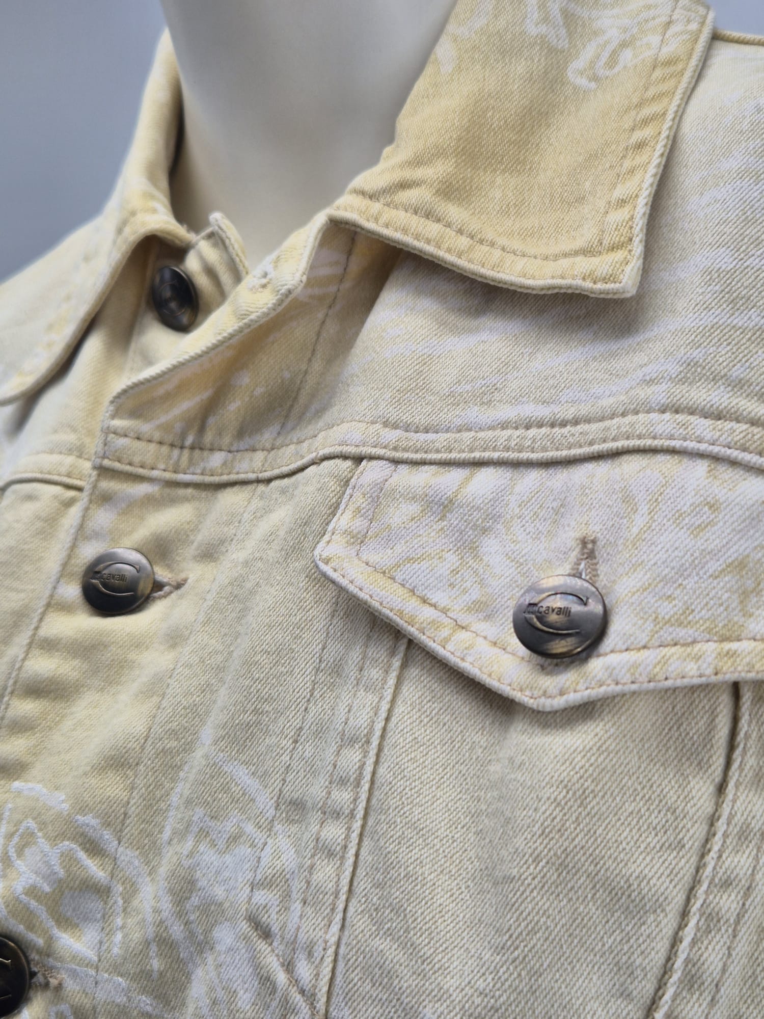 Iconica giacca Roberto Cavalli donna in denim beige con fantasia stampata tono su tono.Modello strutturato stile trucker con chiusura a bottoni logati Cavalli e tasche frontali con patta.Taglio femminile leggermente sagomato che valorizza la silhouette. Fantasia decorativa tipica del brand, elegante ma discreta.