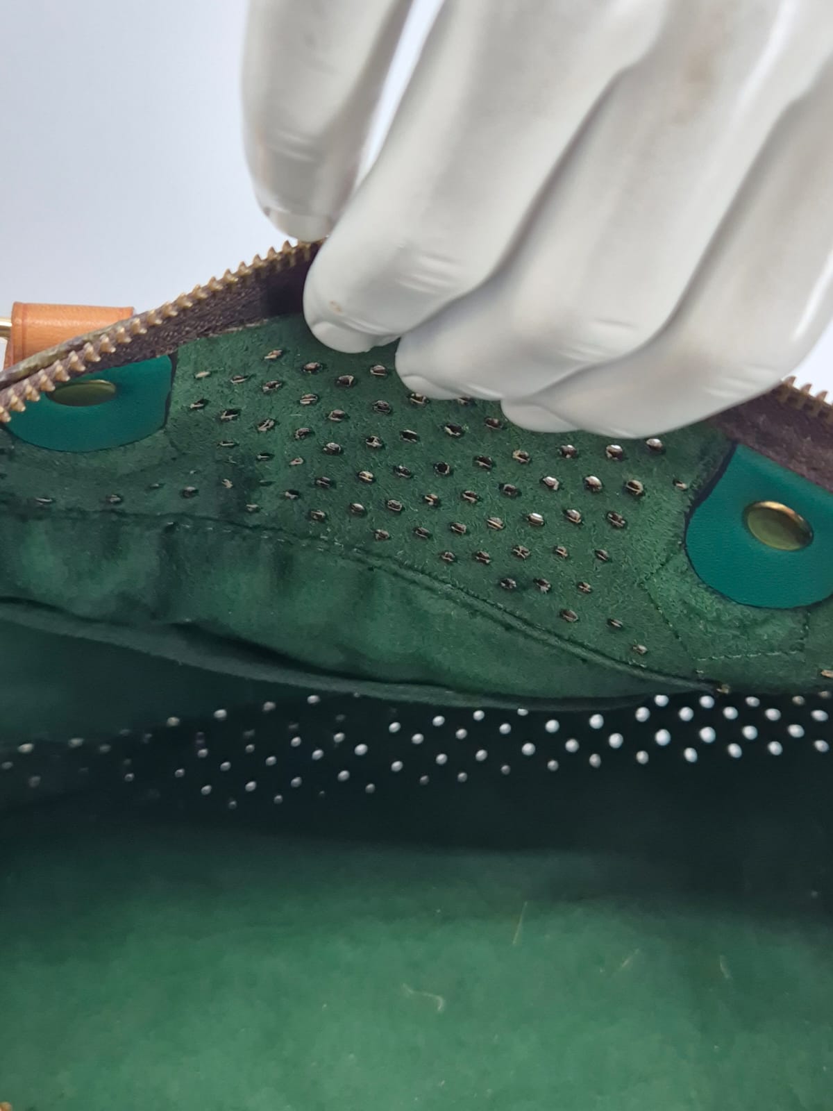 Cursore della zip sostituito con pelle verde coordinata all’interno.