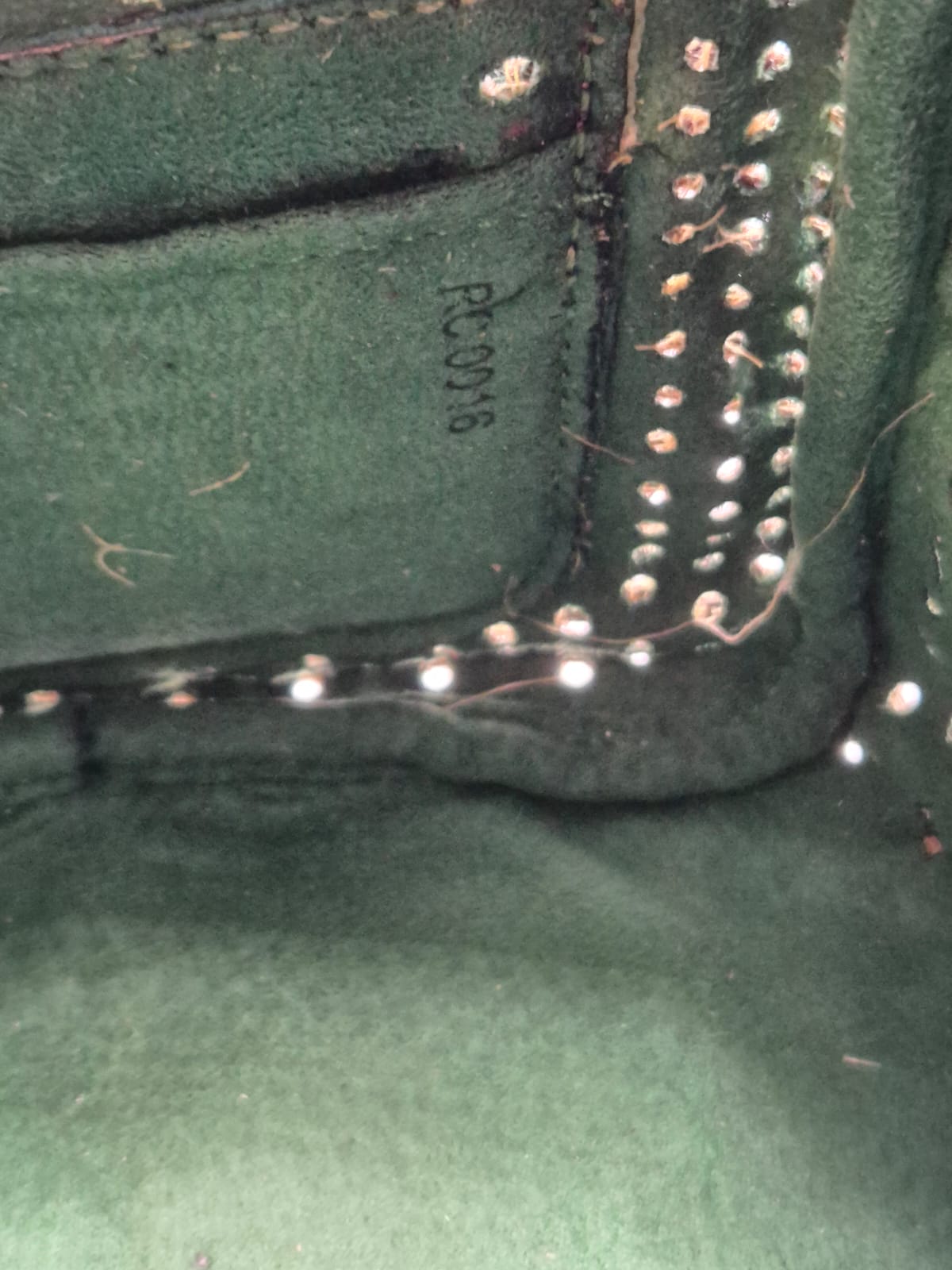 Inserti in pelle verde nei quattro punti di fissaggio delle borchie dorate e nei taschini interni sostituiti.