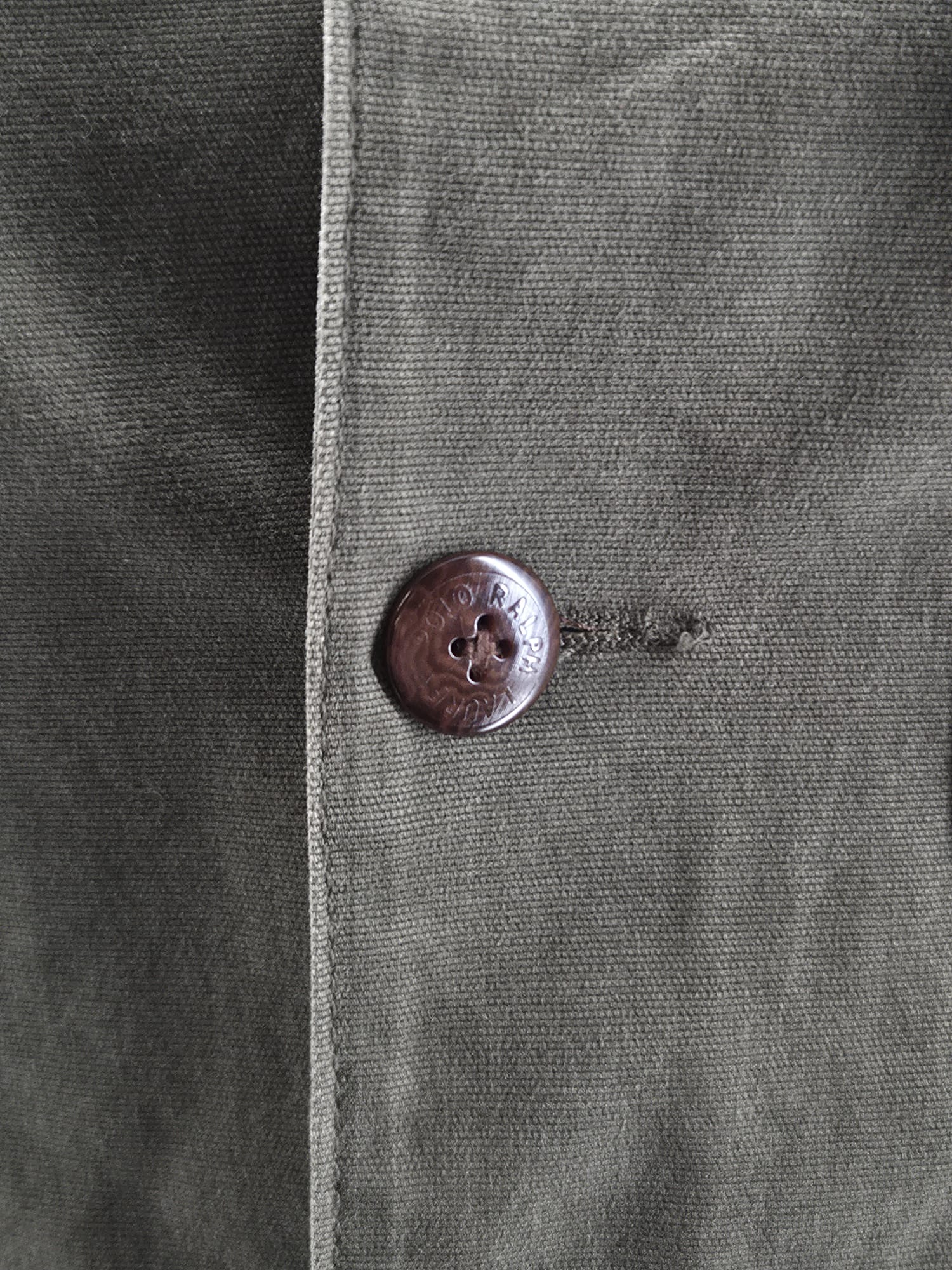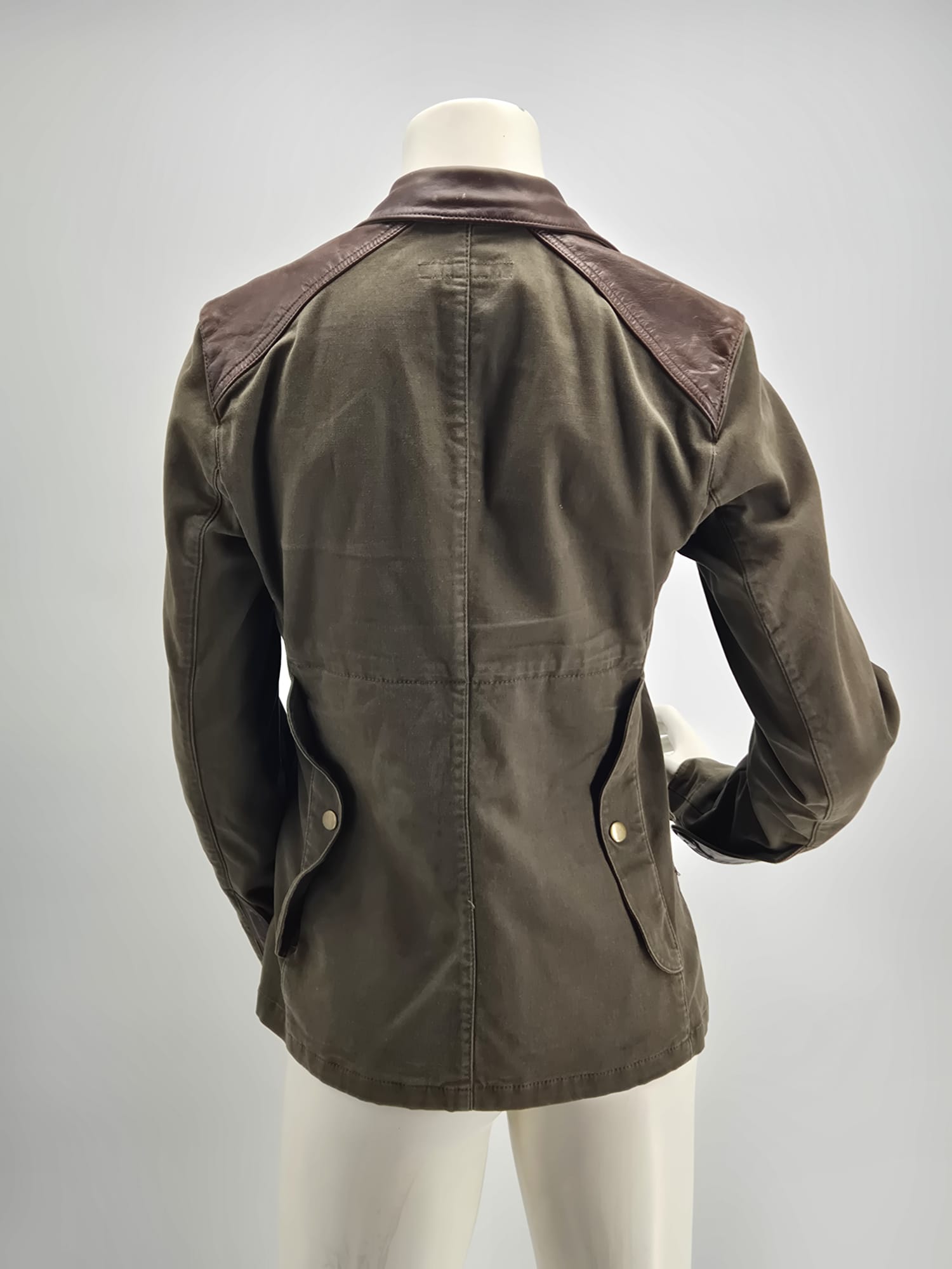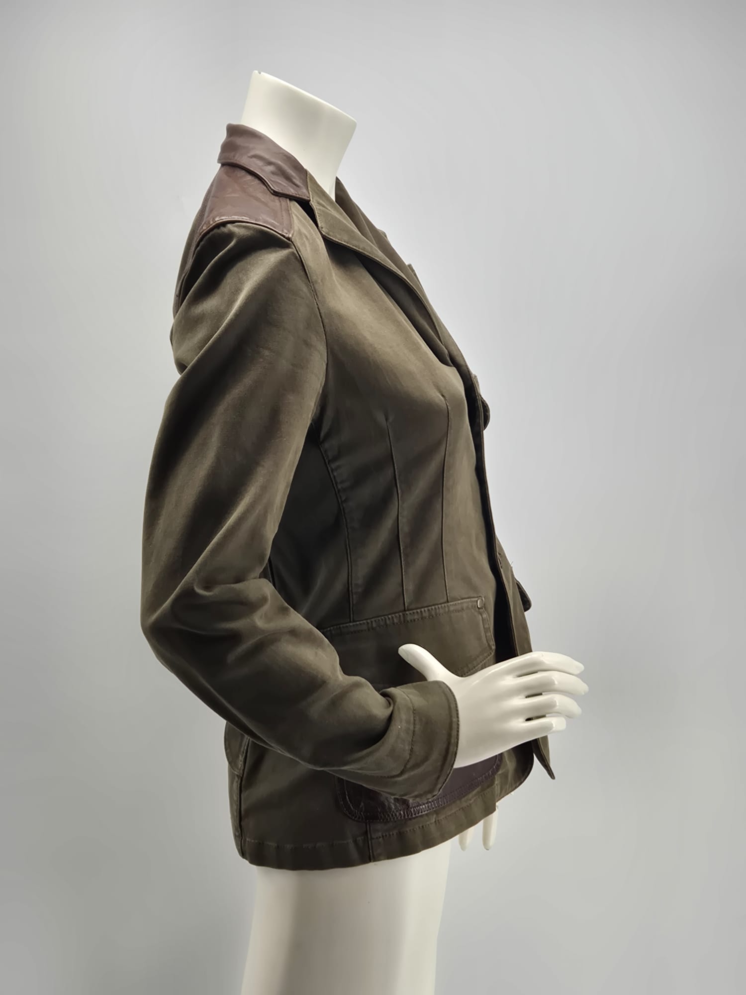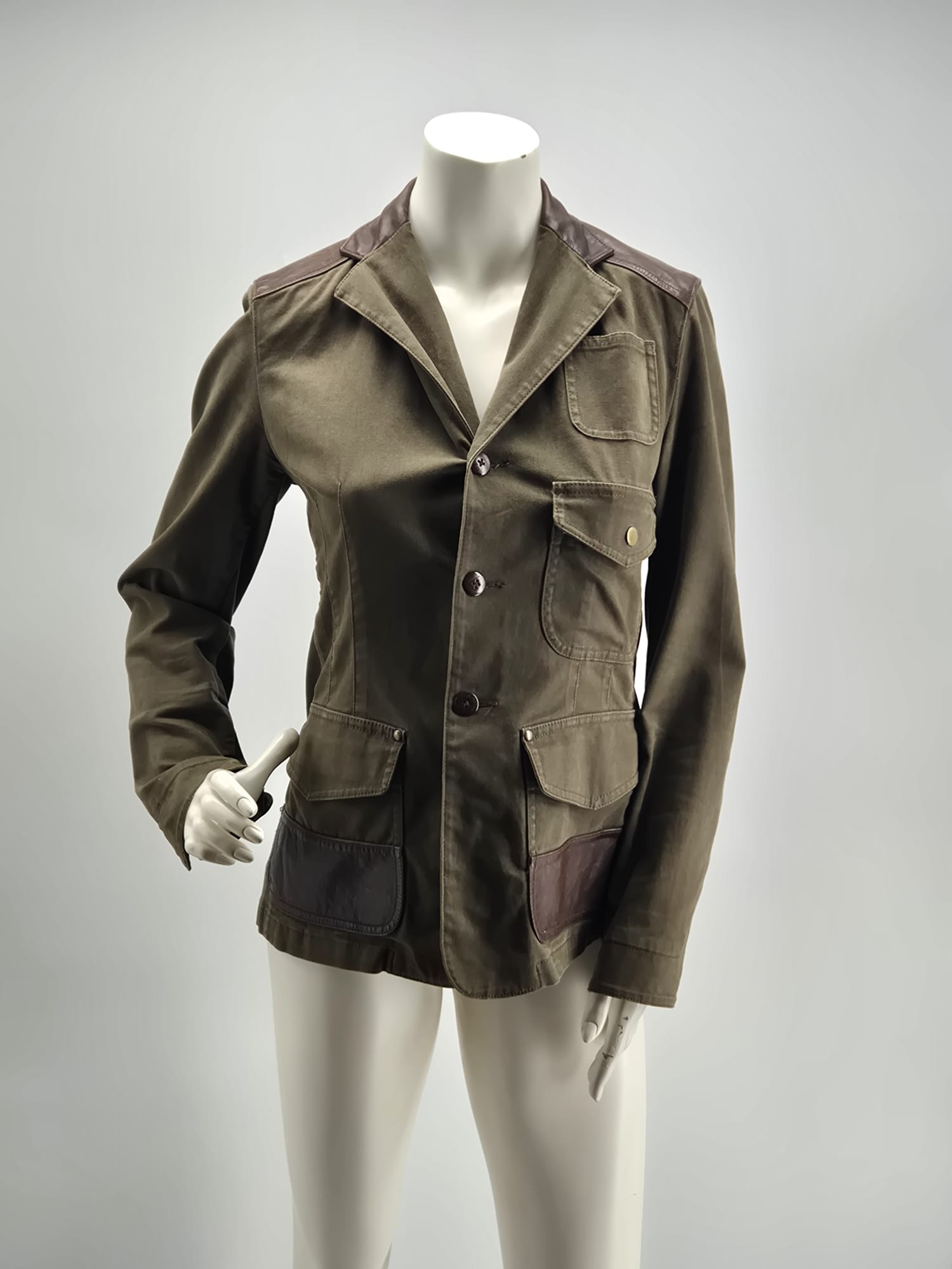 Colore verde militare con raffinati inserti in pelle marrone su spalle e tasche che valorizzano il capo e lo rendono particolare e ricercato.