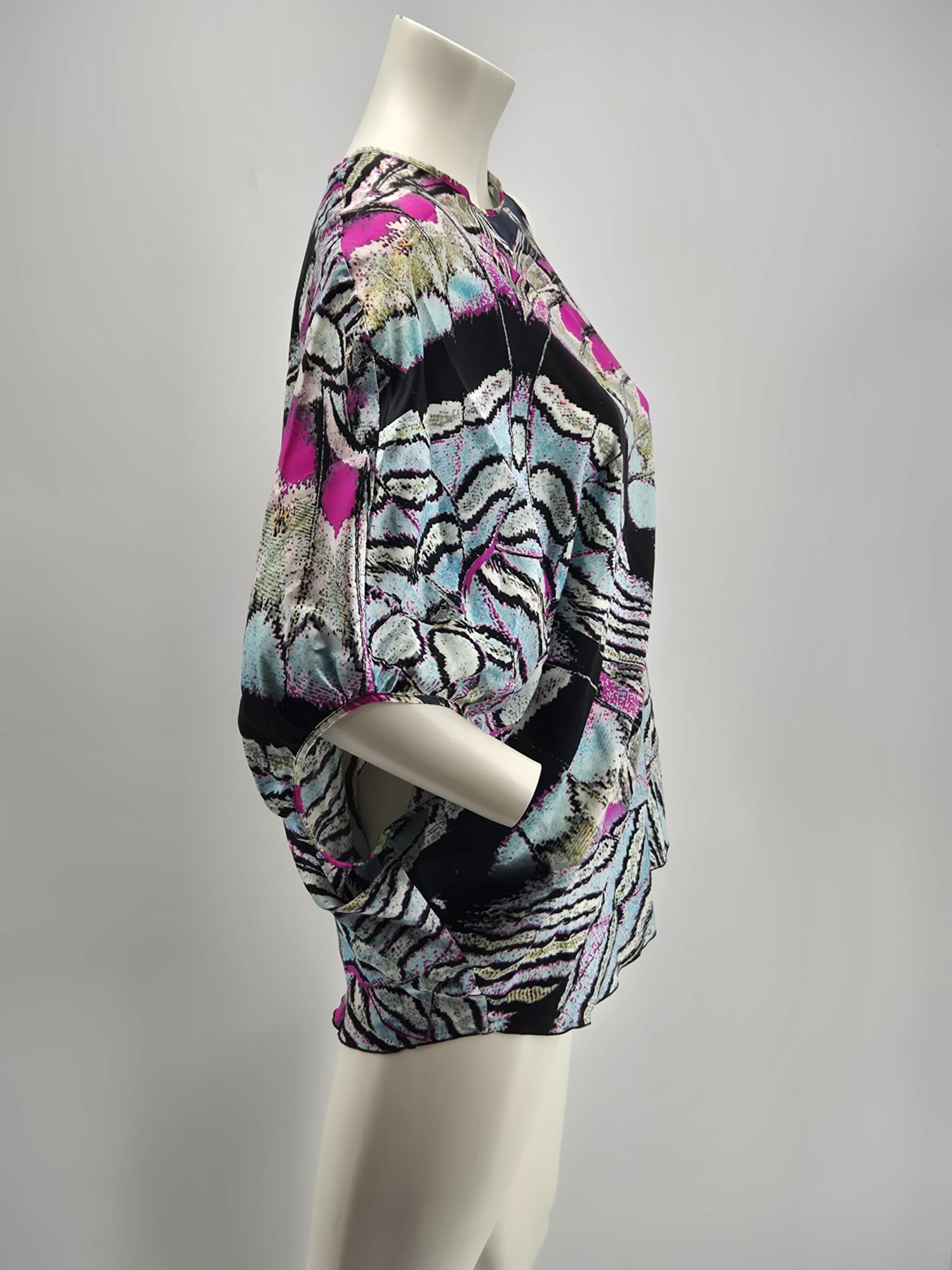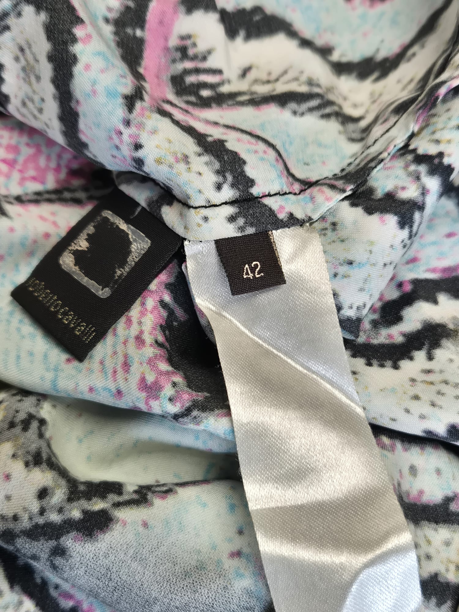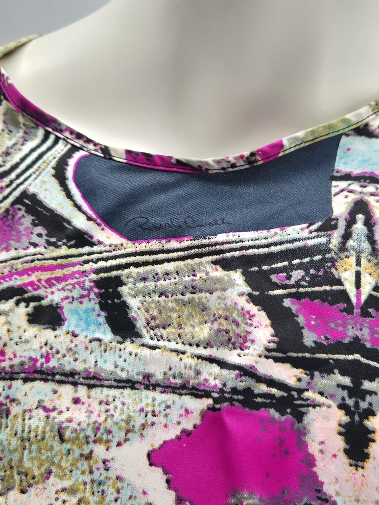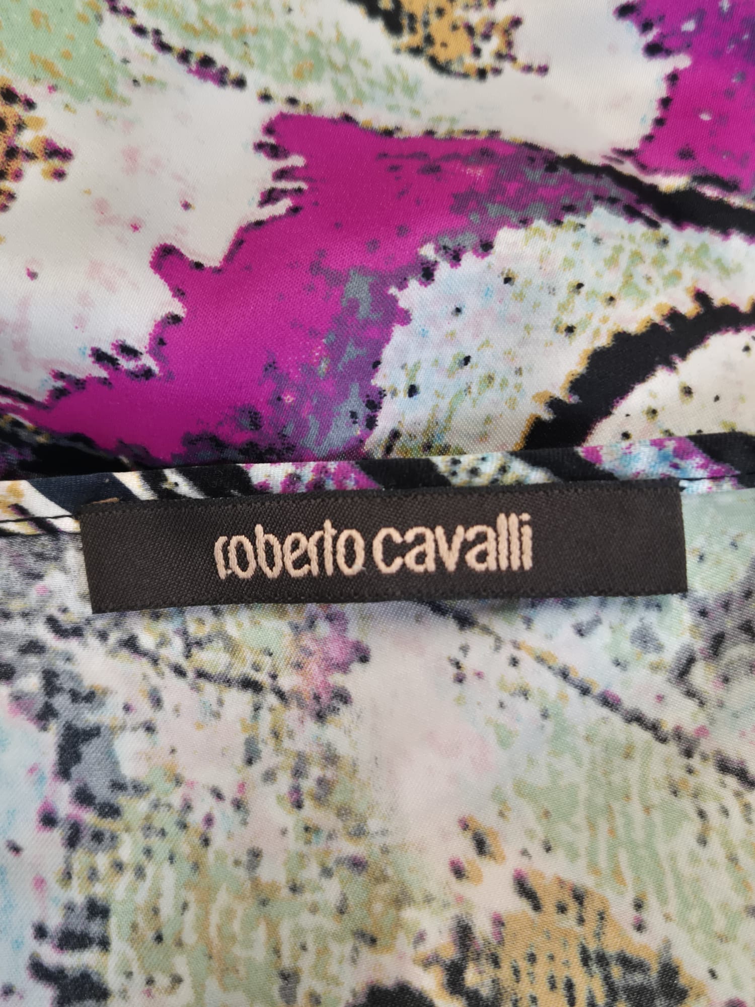 Fantasia multicolor con toni fucsia, azzurro, nero e beige, stampa artistica tipica dello stile Cavalli.